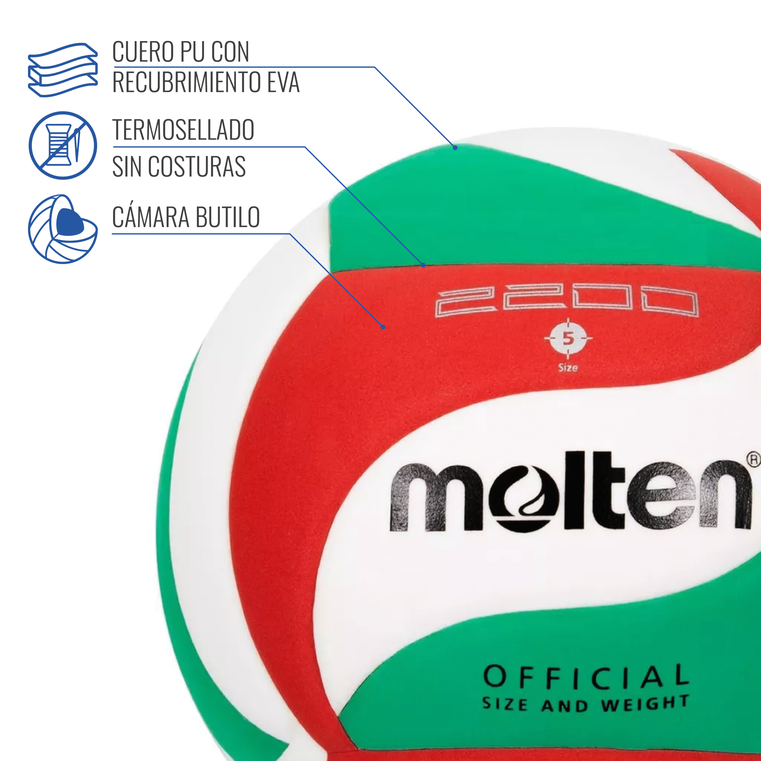 El Balón de Vóleibol Molten V5M 2200 está diseñado para ofrecer máxima suavidad, control y durabilidad en juegos indoor. Fabricado en cuero sintético laminado, proporciona un tacto ultra suave y un rendimiento óptimo en cada golpe. Su cámara de butilo y tecnología termosellada garantizan una mayor retención de aire y estabilidad en el juego.